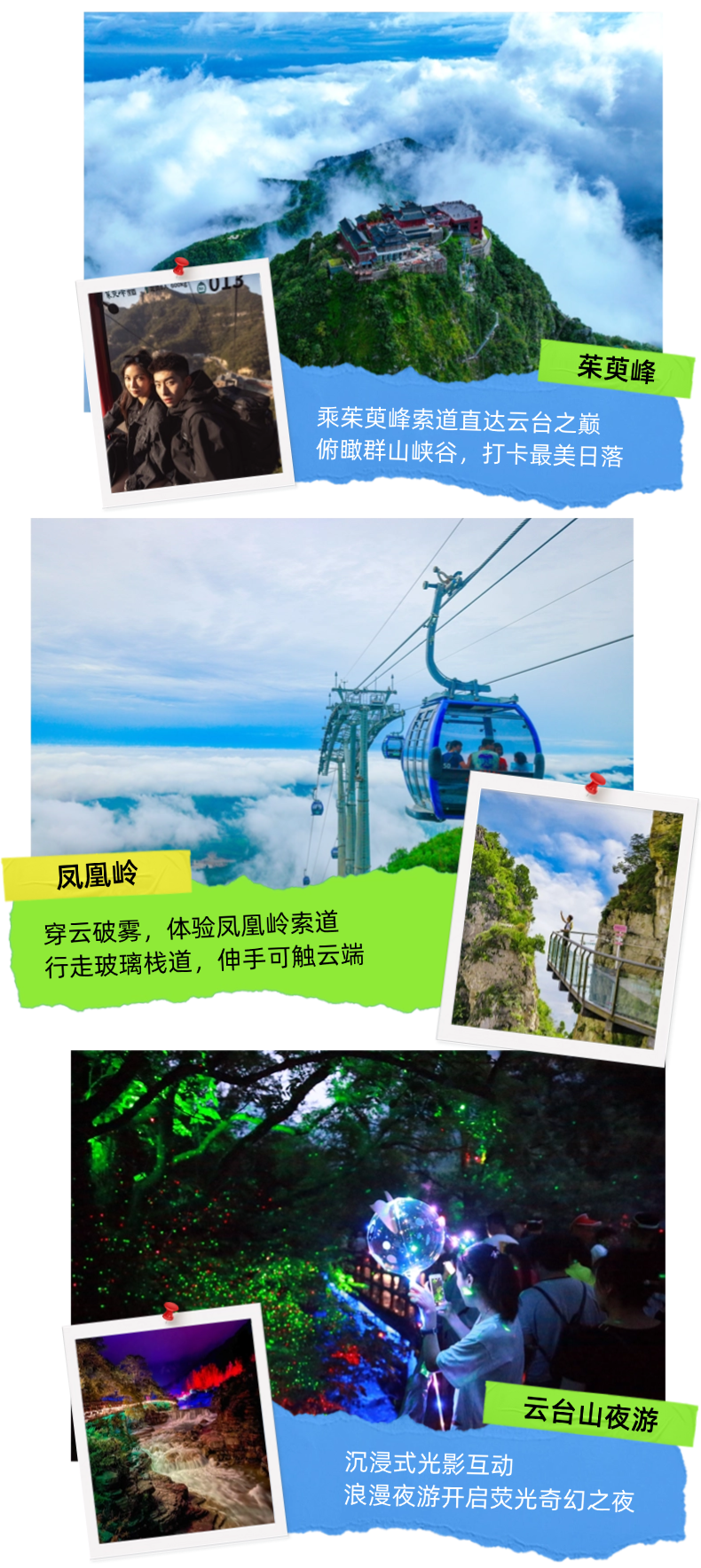 丛林滑道、动物剧场、云台山攀岩、360云景球幕影院、云台山夜游