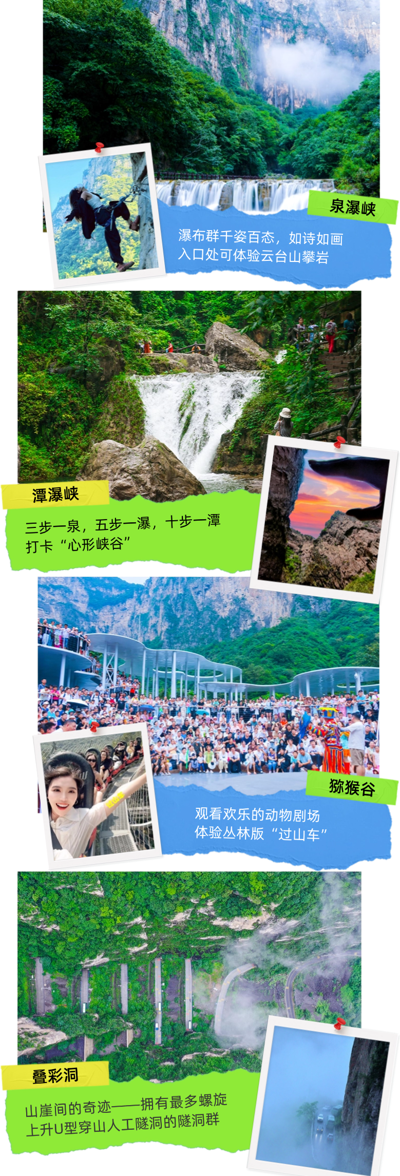 day1:红石峡——子房湖(水上乐园)——泉瀑峡——潭瀑峡——猕猴谷(丛林滑道)——云台山小吃城——云台山夜游