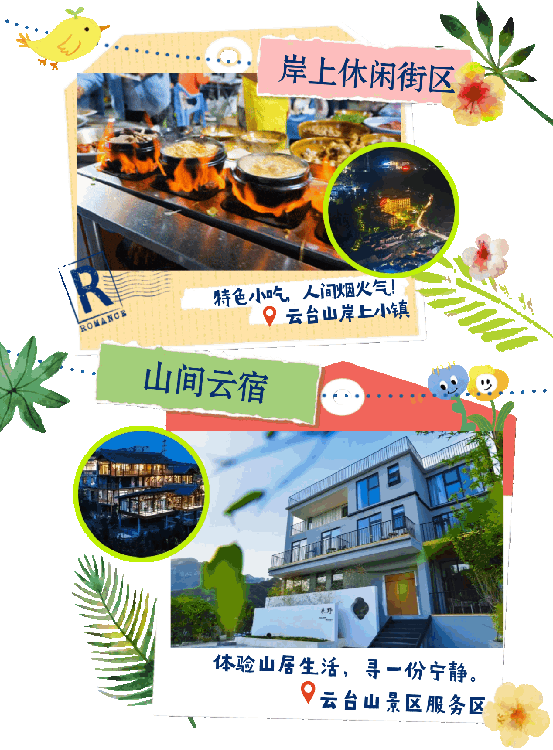 云台山有五家台、古洞窑、黑石岭、岸上等服务区,共有400余家民宿、酒店,可通过美团、携程、抖音搜索“云台山民宿”线上咨询订购。体验山居生活,享一日悠闲,守一分宁静。