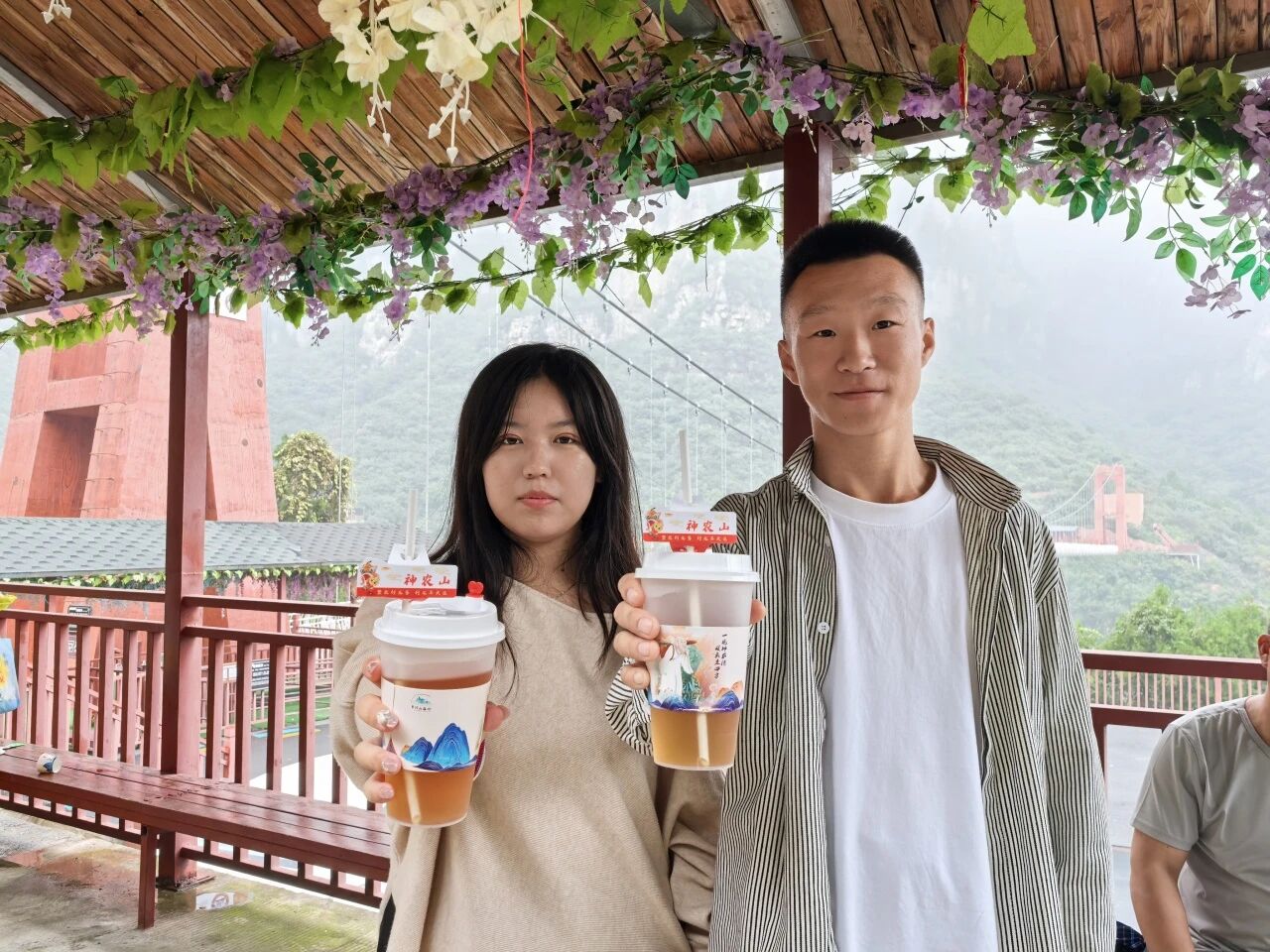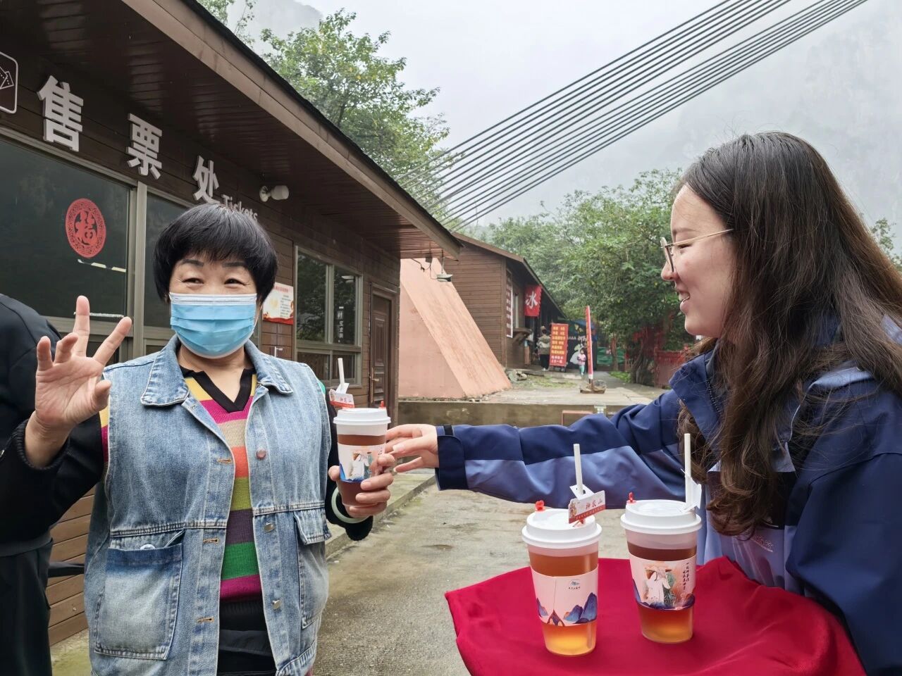 登山途中、休息站点,一杯杯热气腾腾的免费神农百草茶送到游客手中,驱散疲倦。