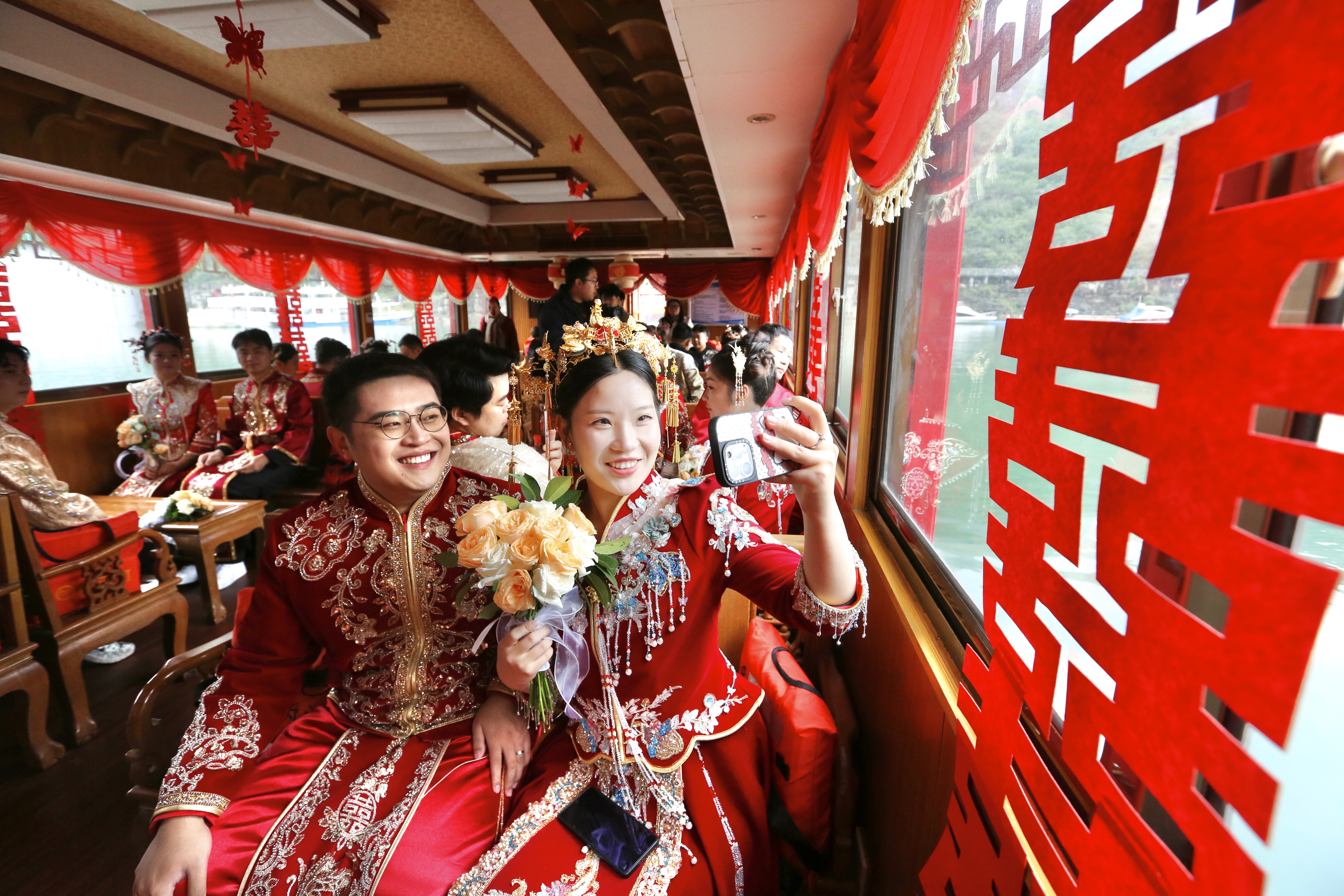 青山作证,绿水为媒。10月10日,博爱首届集体婚礼在青天河景区举办。12对新人神采奕奕,在亲友的见证下永结同心。在举行了简朴又不失庄重、热烈的仪式后,新人登上景区精心准备的婚船,畅游青天河。游览过程中,他们自信地展示才艺,载歌载舞,庆祝大婚。青天河景区向他们赠送旅游年票,以表祝贺。