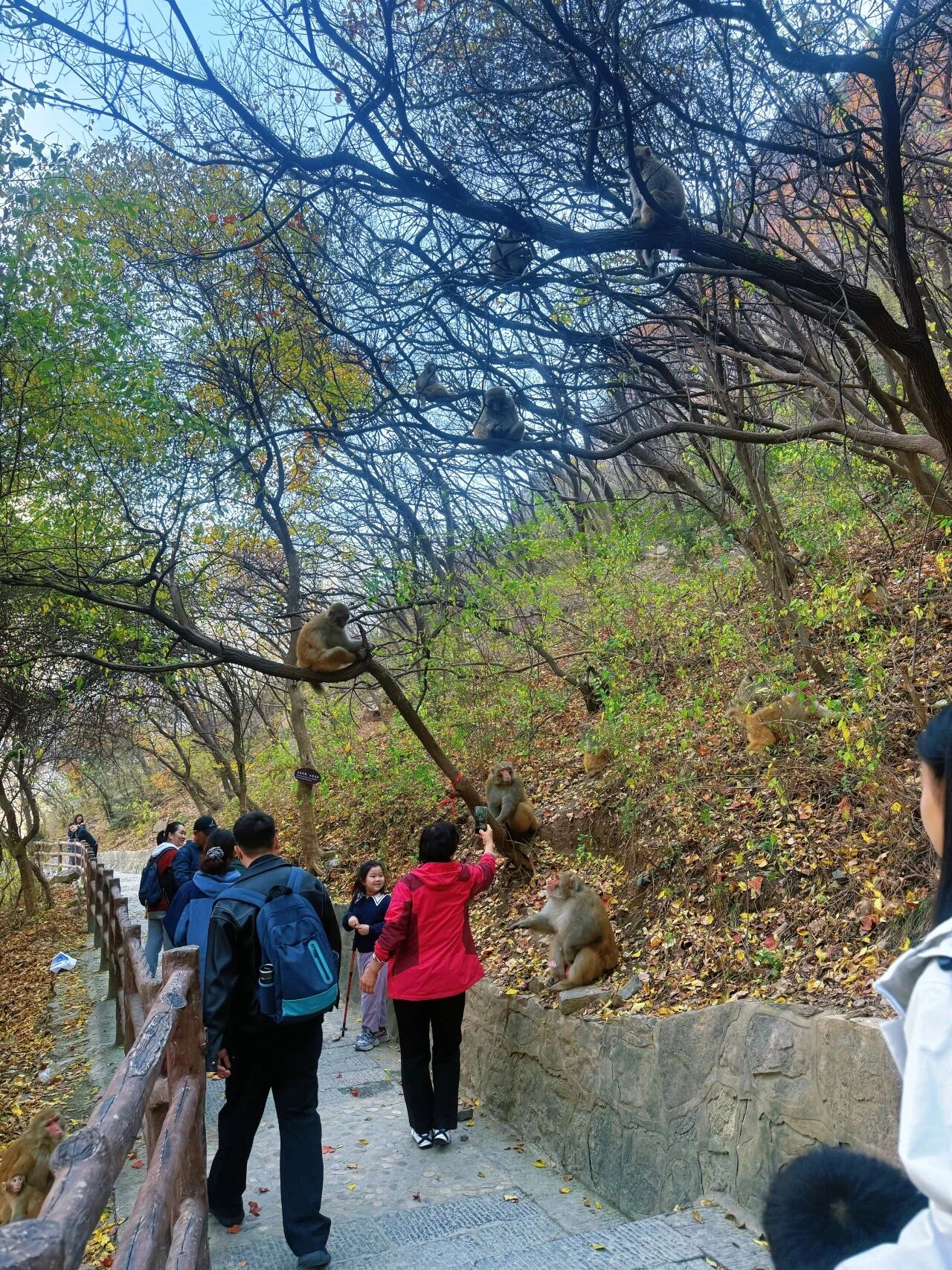 几只猕猴大大方方地凑过来,有的盯着游客手里的零食,有的蹲在树枝上“围观”拍照,圆溜溜的眼睛透着机灵,逗得大家笑个不停。