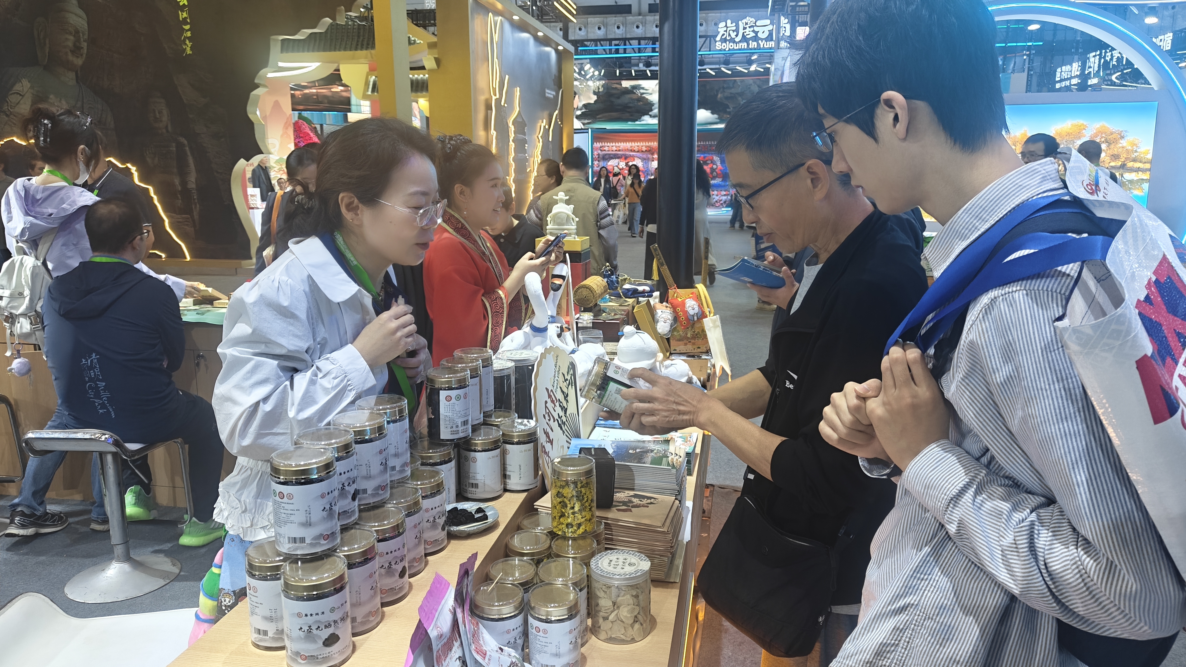 河南展厅里,焦作展台前人头攒动、热闹非凡。我市特色文化产品绞胎瓷、文创冰箱贴以及包装精美的“药食同源”四大怀药系列产品备受瞩目和青睐,吸引众多参会代表和群众驻足观看、交流和品鉴。人类非物质文化遗产太极拳表演更是受到热捧,太极拳还与少林功夫进行梦幻联动,一招一式如行云流水,获得与会嘉宾和观众的喝彩和好评。国家级非物质文化遗产九蒸九晒炮制技艺大师工坊制作的“药食同源”系列地黄产品,兼具食用和药用价值,备受嘉宾和观众的喜欢,所带产品尽数销售,在旅交会上取得了不菲的社会效益和经济效益。