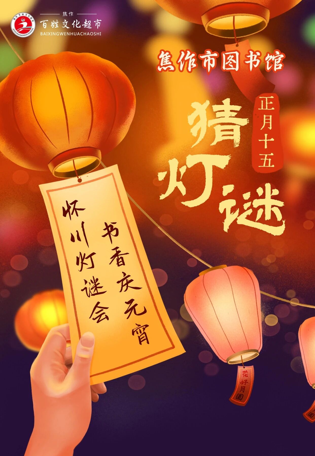为弘扬中华优秀传统文化,丰富群众精神文化生活,营造欢乐祥和的节日氛围,在元宵佳节来临之际,焦作市图书馆“怀川灯谜会 书香庆元宵”活动火热来袭!