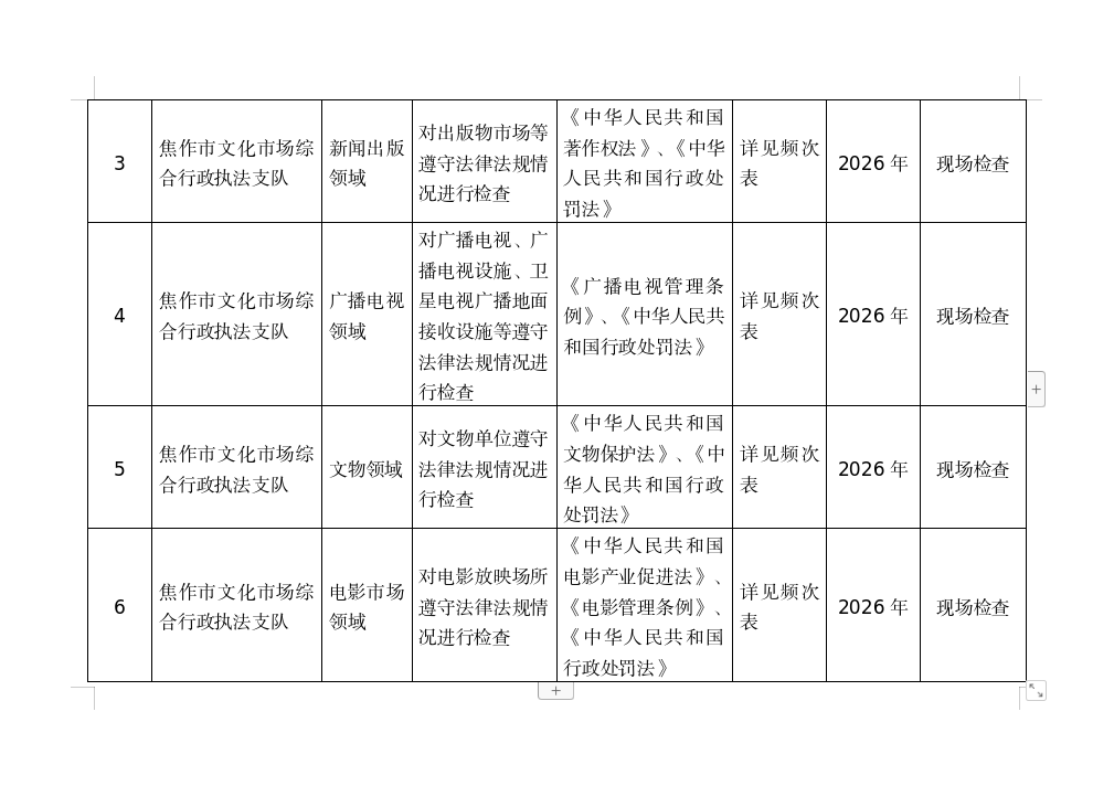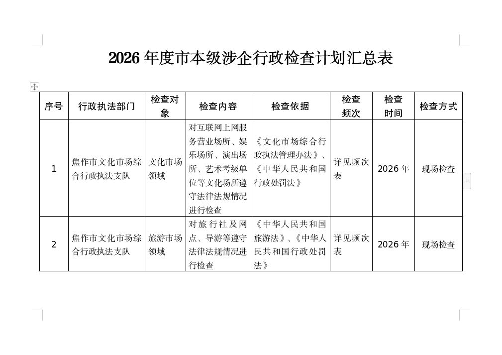 2026年度市本级涉企行政检查计划汇总表