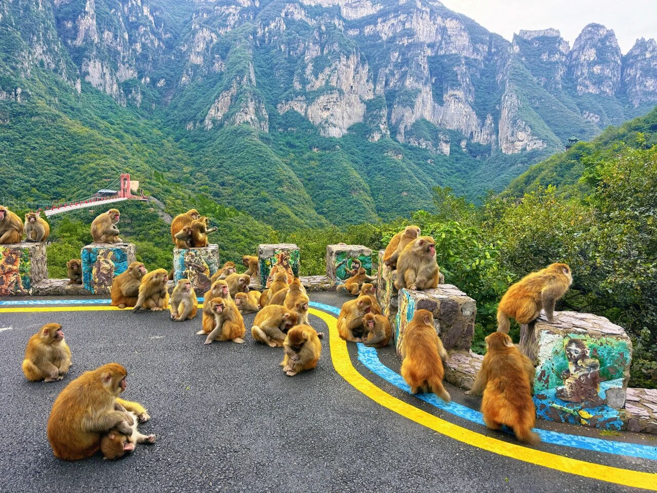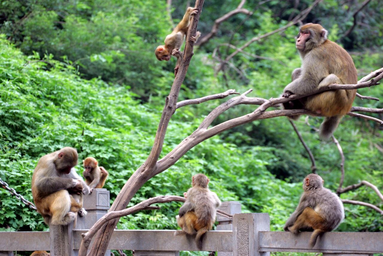 独特的吆喝声在山间回荡。片刻后,林子里便传来窸窸窣窣的响动,一只只太行猕猴攀着岩壁跃出,在猴王带领下,循着声音纷纷聚拢而来。