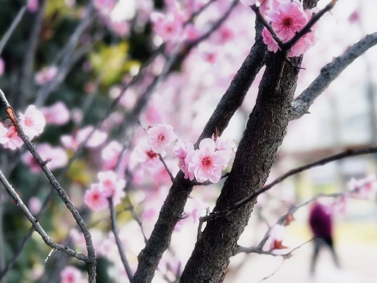 美人梅盛开如画,粉嫩的花瓣层层叠叠,宛如少女的裙摆,在微风中轻轻摇曳。