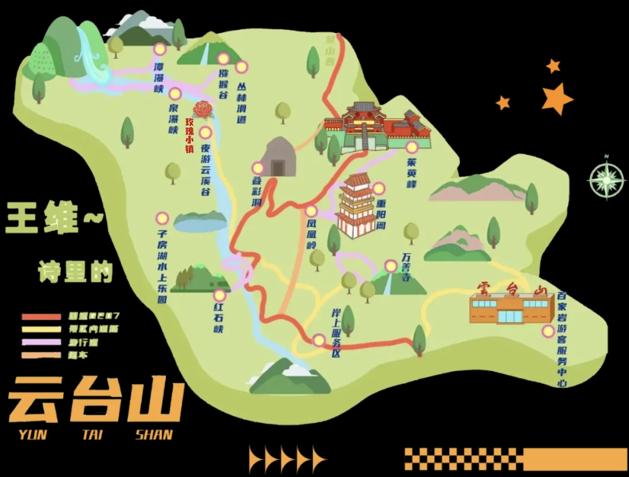 小寨沟·玫瑰小镇—潭瀑峡、泉瀑峡(环湖小火车、360球幕影院、云台山攀岩、丛林穿越)—猕猴谷(丛林滑道)—红石峡—子房湖(水上乐园)—晚上·云台明月焰(📍岸上停车场)—住宿·岸上小镇