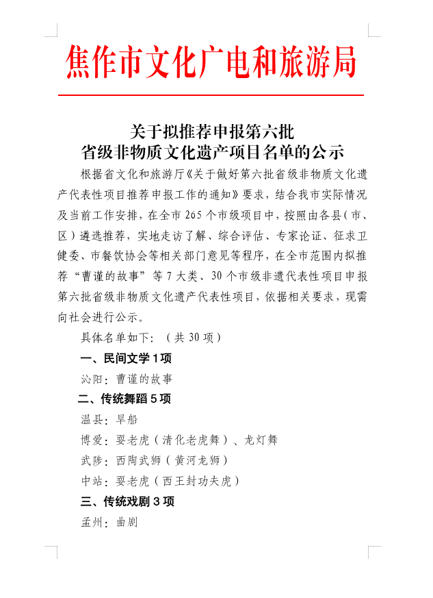 关于拟推荐申报第六批 省级非物质文化遗产项目名单的公示