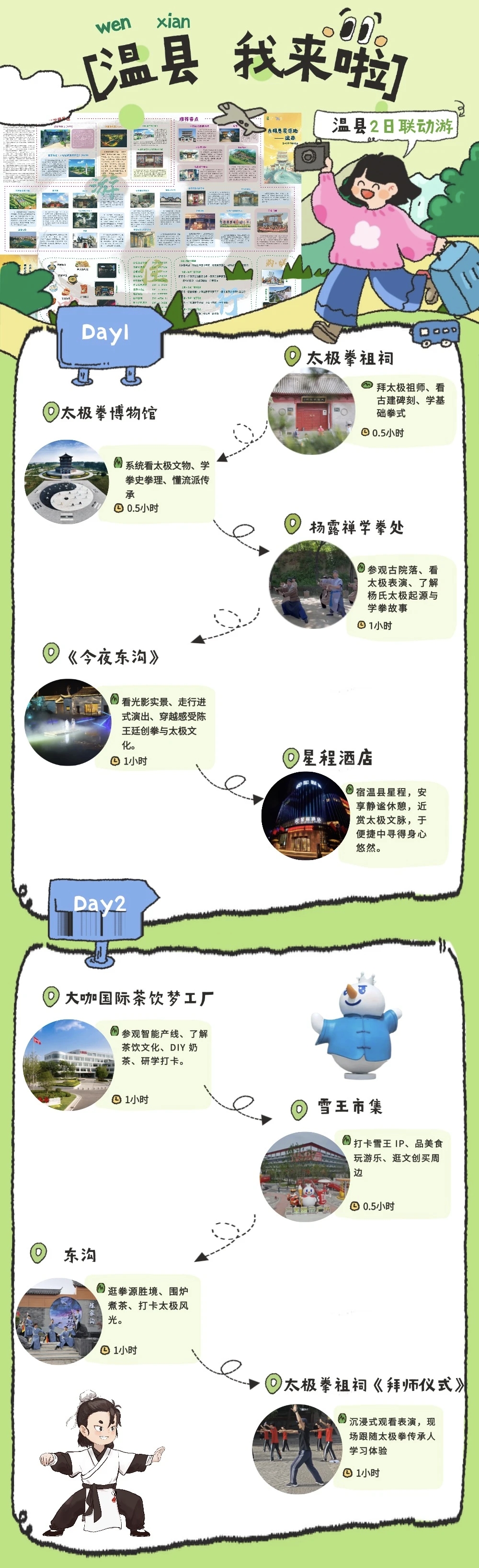 当百年太极文脉遇上潮流茶饮,当古村古韵碰撞光影科技,一场文武兼修、动静相宜的两日之旅,在温县缓缓展开。这里是国家4A级景区、人类非物质文化遗产太极拳的发源地,400年武脉生生不息;这里也是潮流打卡地,雪王市集、实景演艺焕新文旅体验。两日时光,寻根、学拳、赏演、逛市集,一站式解锁太极康养与潮流趣玩!